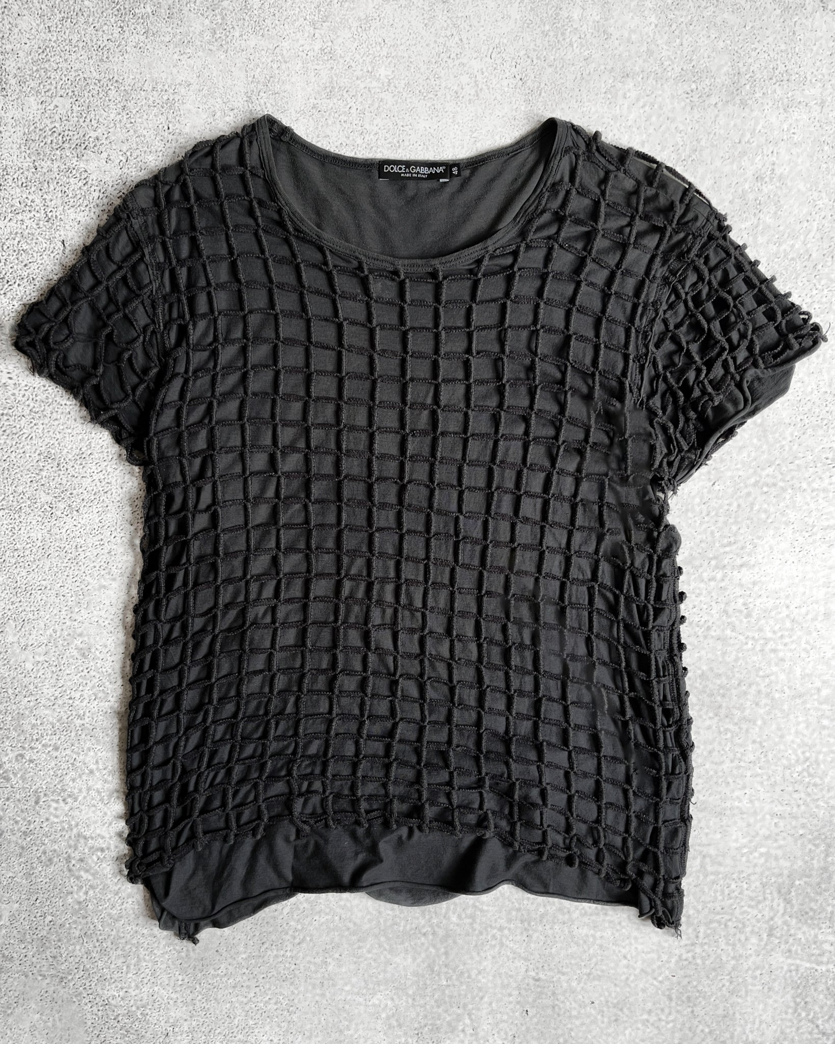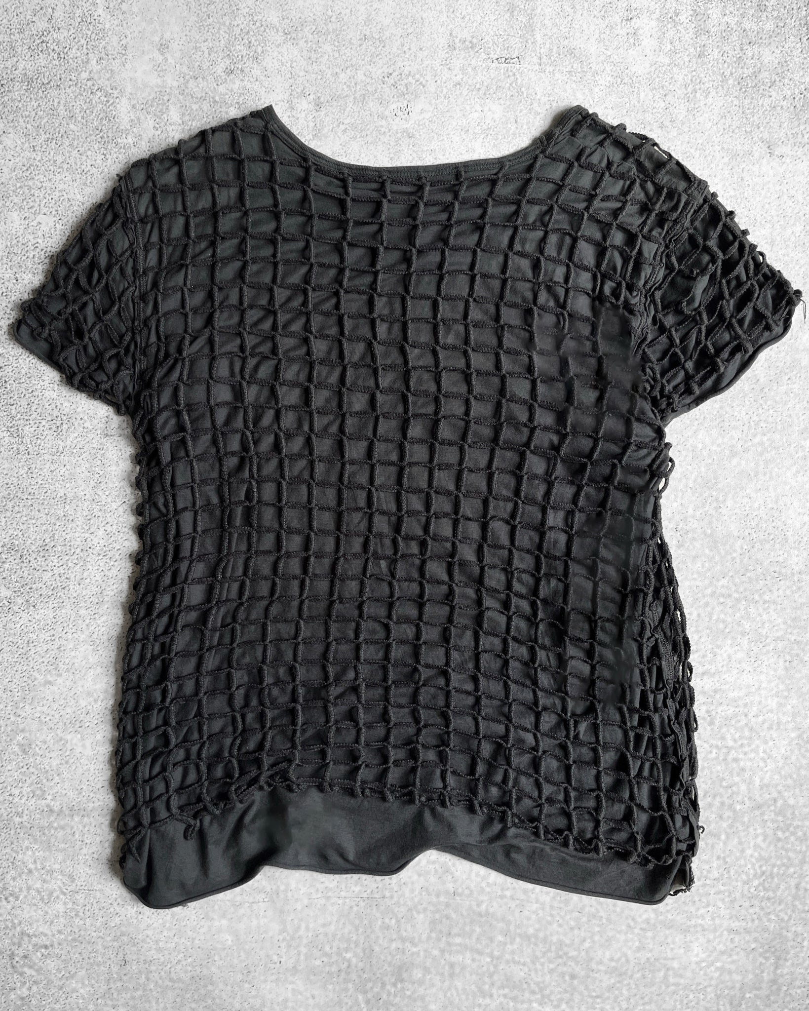 The double layered tee comes with a cotton base and is detailed with a layer of sewn on netting over the entirety of the piece.