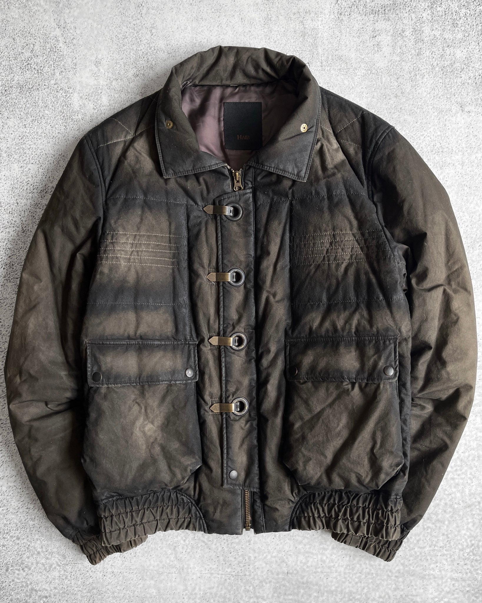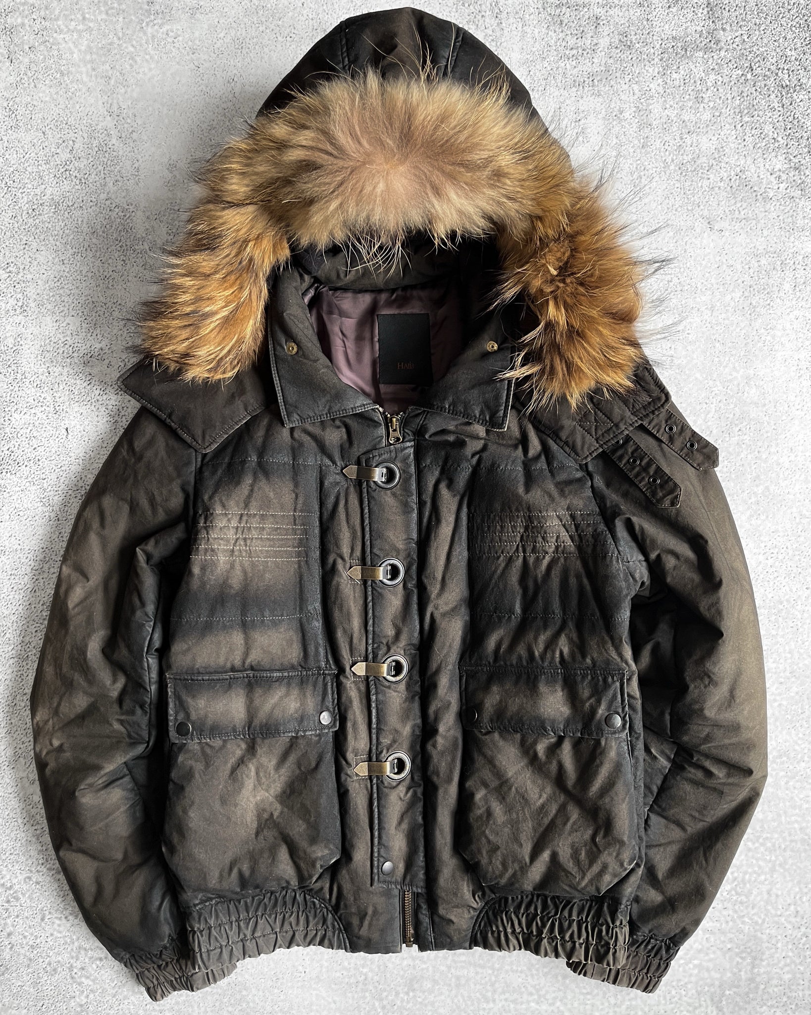 This jacket from the early 2000s comes in an incredible wash and features a very interesting closing mechanism, detachable racoon fur hood and overall cropped fit.