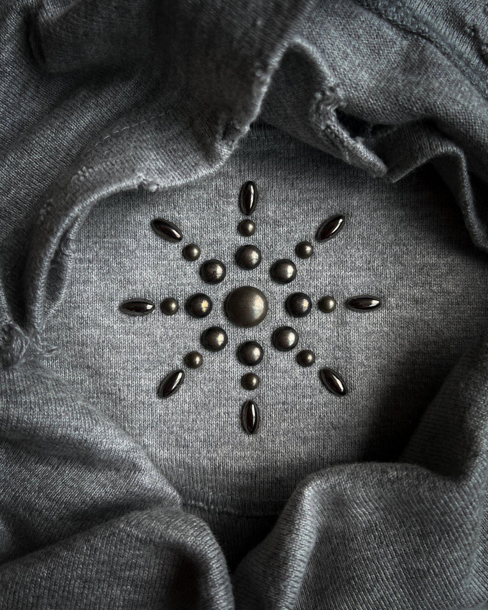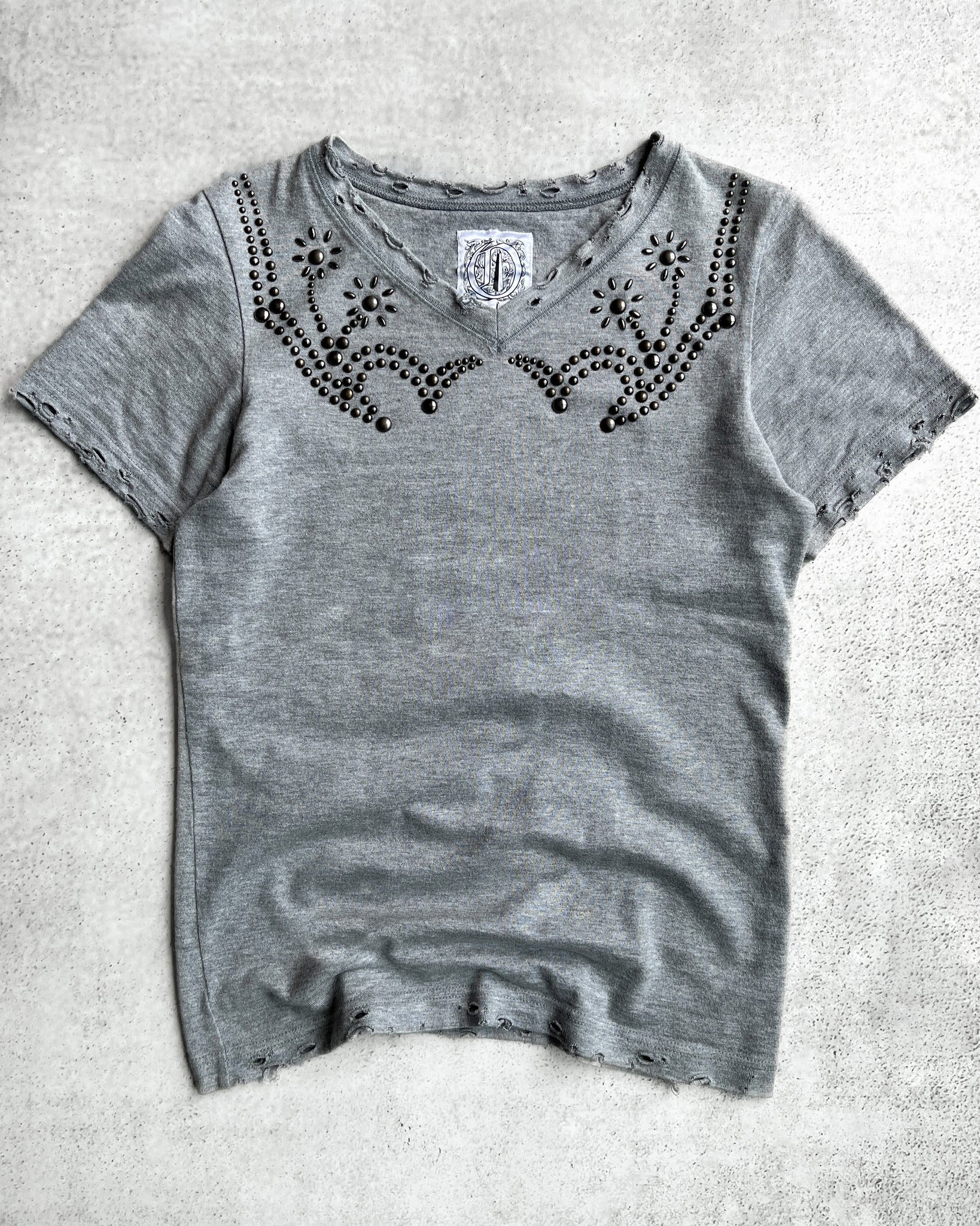 This early 2000s Obelisk tee comes with distressing along the hems and neckline and features ornamental brass studs on the chest and back.