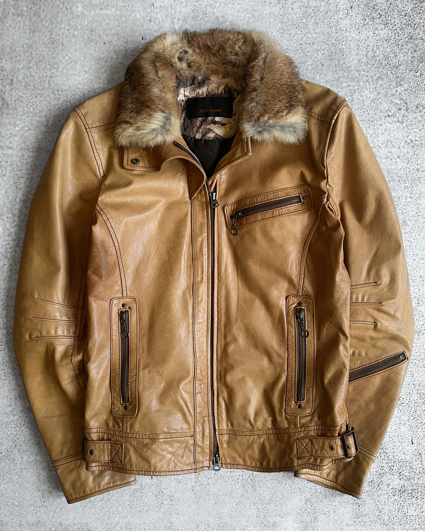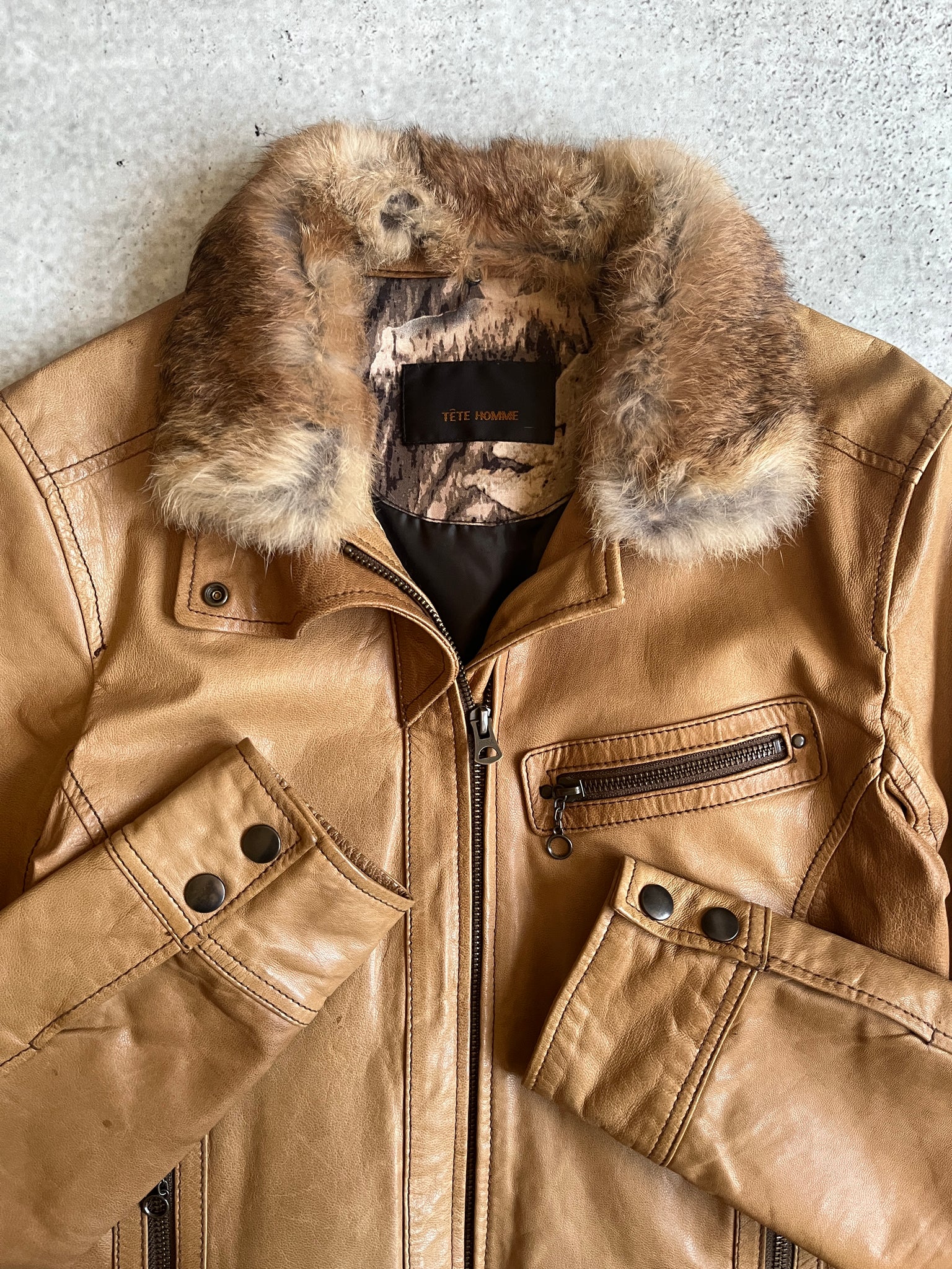 This tan leather jacket from the early 00s features a removable rabbit fur collar and whiskering on the sleeves and a number of chain pull zipper pockets throughout. Slight tear in lining to be considered.