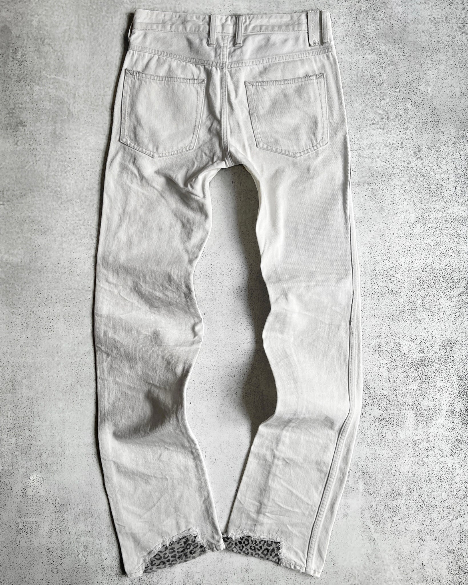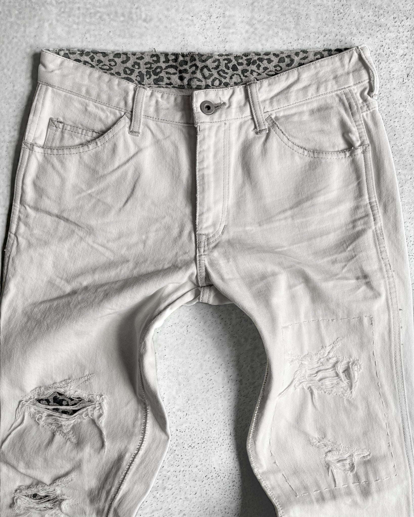 These slim fitting pants from 2011 feature distressing throughout, repaired with leopard print leather behind the knee blowouts and heel bite.